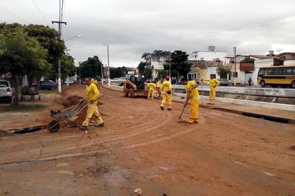 Homens da limpeza pública do município trabalhavam desde as primeiras horas da manhã na diminuição da lama no entorno do canal do Rio Grangeiro. Por conta das obras de urbanização da encosta do bairro Seminário, lamaçal e muita areia encheram o espaço das ruas Diógenes Frazão e Nova Olinda.